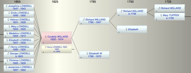 | 1826 | Cordelia WILLARD was born | Brighton, Sussex, England | 11, 13, 15, 28 | ||
